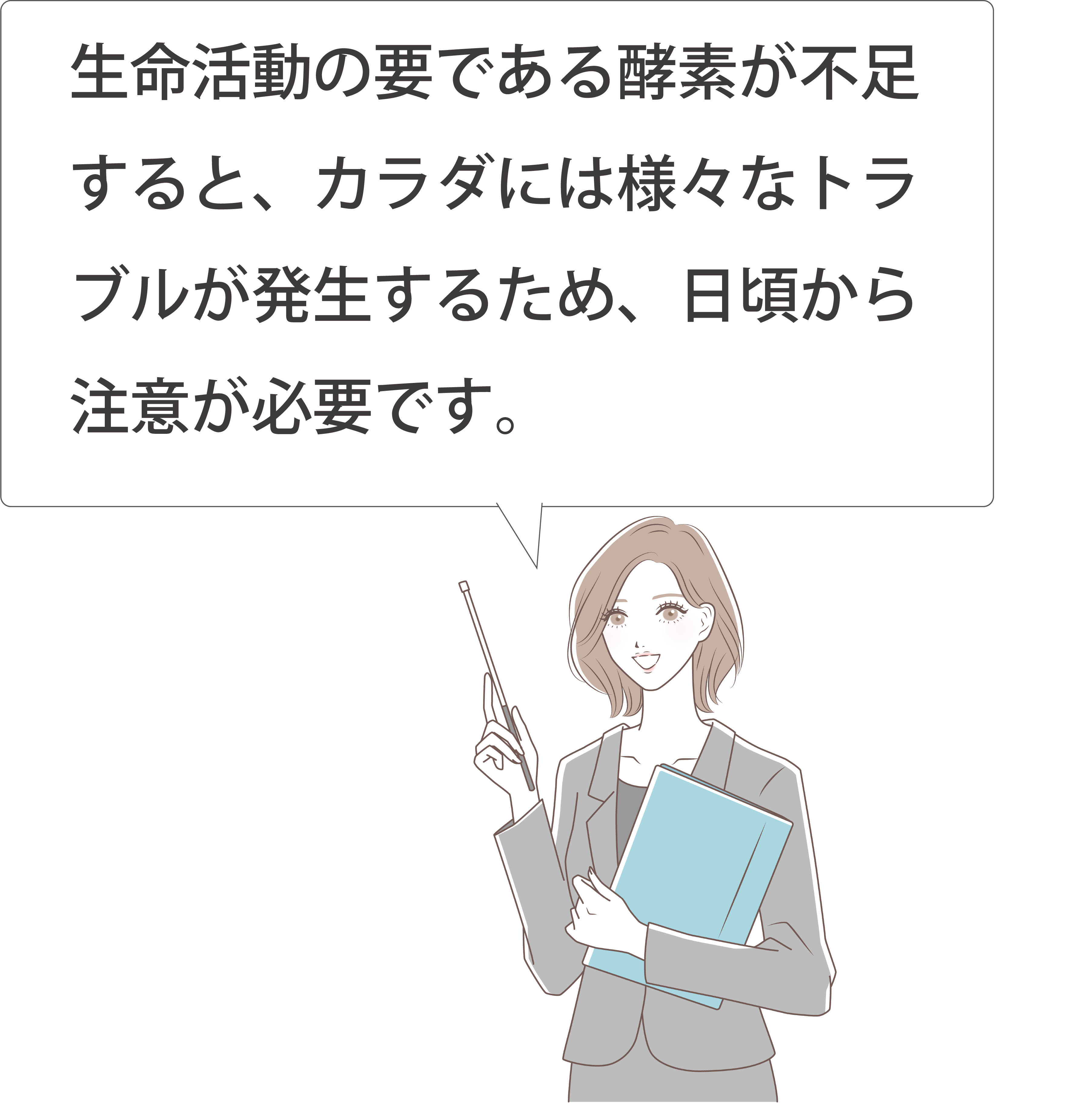 人間の体内でも、酵素は生命維持に欠かせない役割を果たしています。食事を消化・吸収するための消化酵素や、細胞の修復やエネルギー産生に関わる代謝酵素など、多くの酵素が健康維持のために機能しています。しかし、加齢やストレス、偏った食生活などが原因で酵素の働きが低下すると、体の巡りや代謝にも影響が出る可能性があります。
