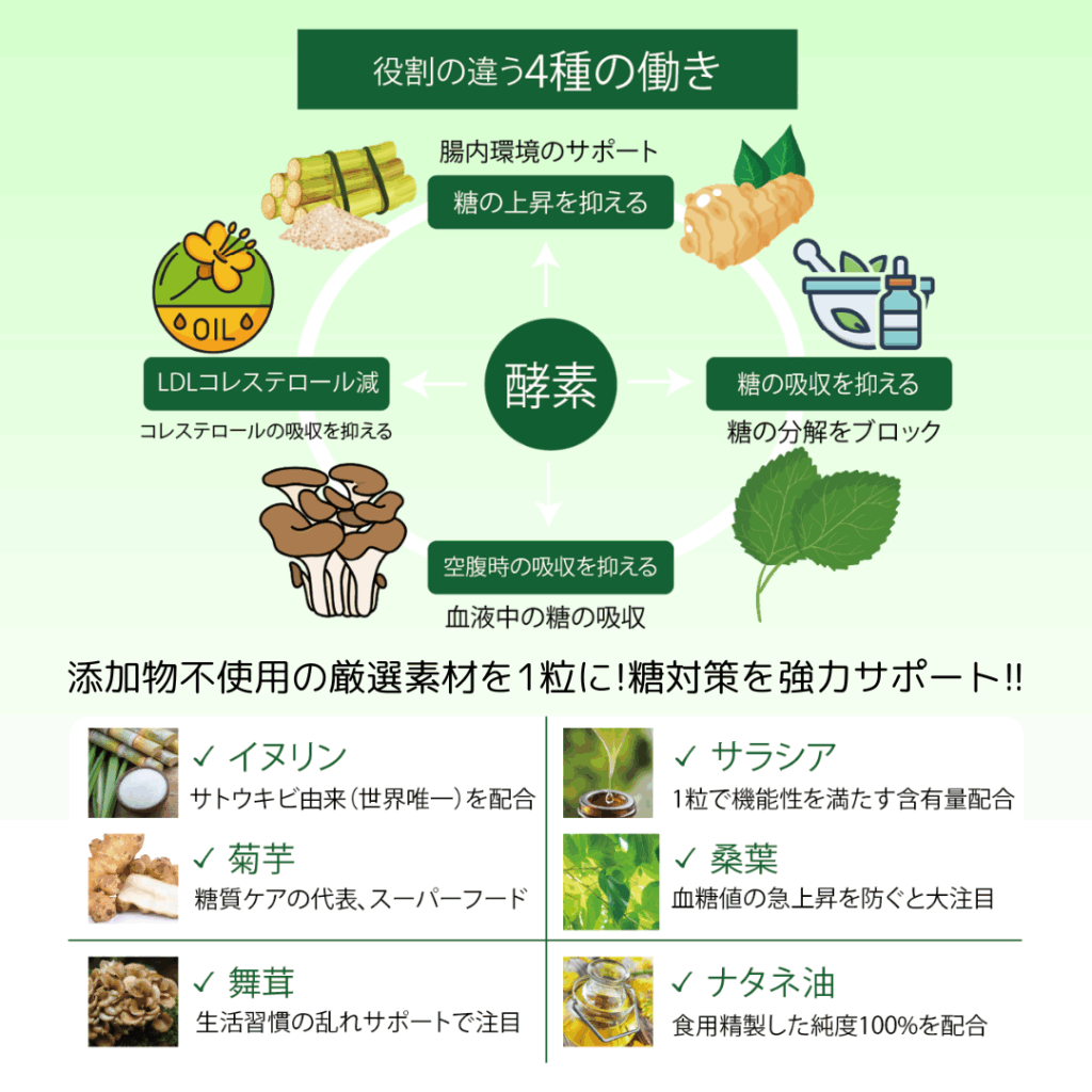 原材料名:イヌリン(タイ産)、サラシアエキス(国内製造)、桑葉末(国内製造)、菊芋末(熊本産)、硬化ナタネ油(食用精製加工油脂、国内製造)、澱粉分解物(国内製造)、醗酵玄米(富山産)、穀物発酵抽出末(インド製造)、舞茸子実体エキス末(国内製造)、(一部に小麦を含む)